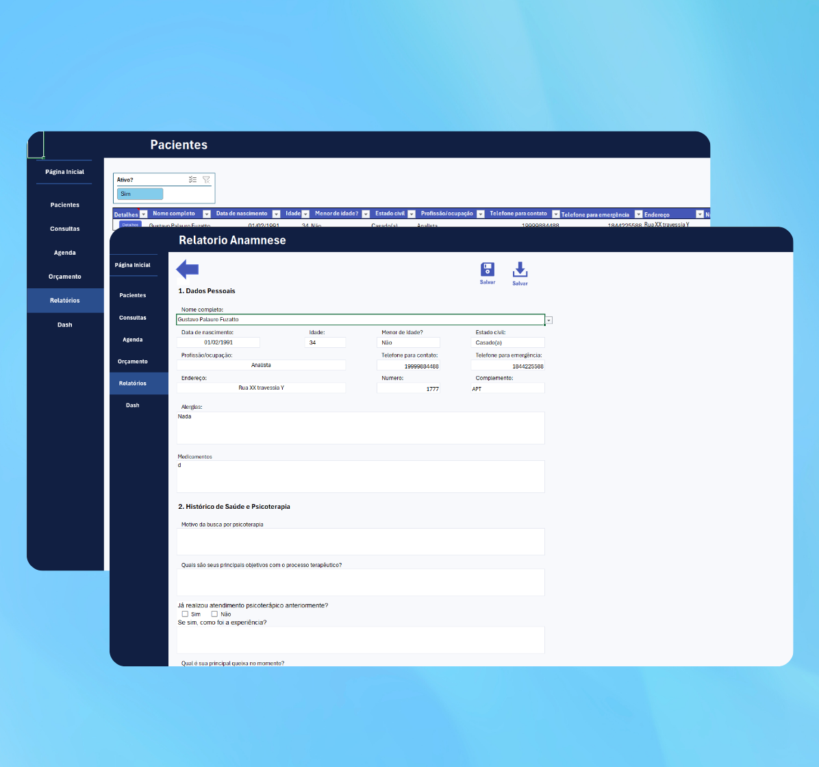Organize seu trabalho com a flexibilidade e praticidade que você precisa. Tenha total controle sobre as informações dos seus pacientes e das sessões que você fez, tudo isso sem depender da internet e diretamente no seu computador!